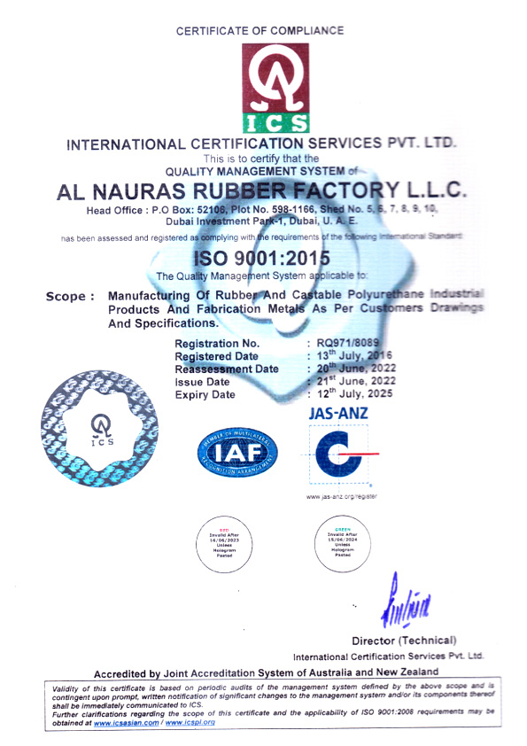 Al Nauras Rubber Factory L.L.C (ANRF) was set up in 1996 and has been the leading manufacturer and supplier of Industrial grade Polyurethane and Rubber Products in the region. ANRF is an ISO 9001-2000 Certified company which is located in the prime industrial area within Dubai Investment Park. We have a facility spanning over 25,000 Sq/ft. consisting of high-tech machines, experienced machine operators and Rubber technicians.